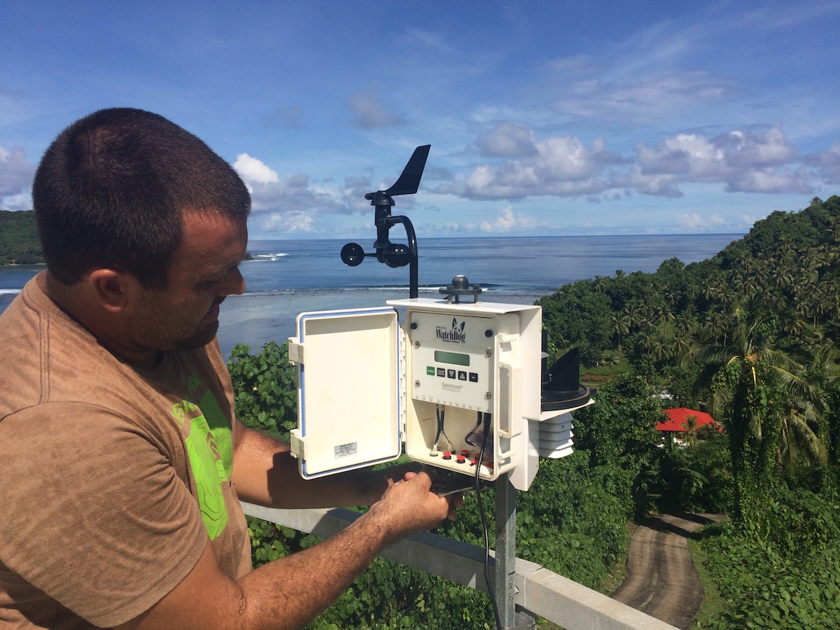 As part of their commitment to the project, American Samoa Power Authority created a full-time hydrologic technician position to develop and maintain monitoring instruments. Here, technician Matt Erickson checks a weather station in Eastern Tutuila.